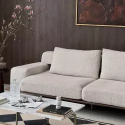 Студия в светлых тонах с декоративными металлическими рейками, изысканной мебелью. Зал находится на солнечной стороне, а панорамные окна в пол придают залу свою изюминку.