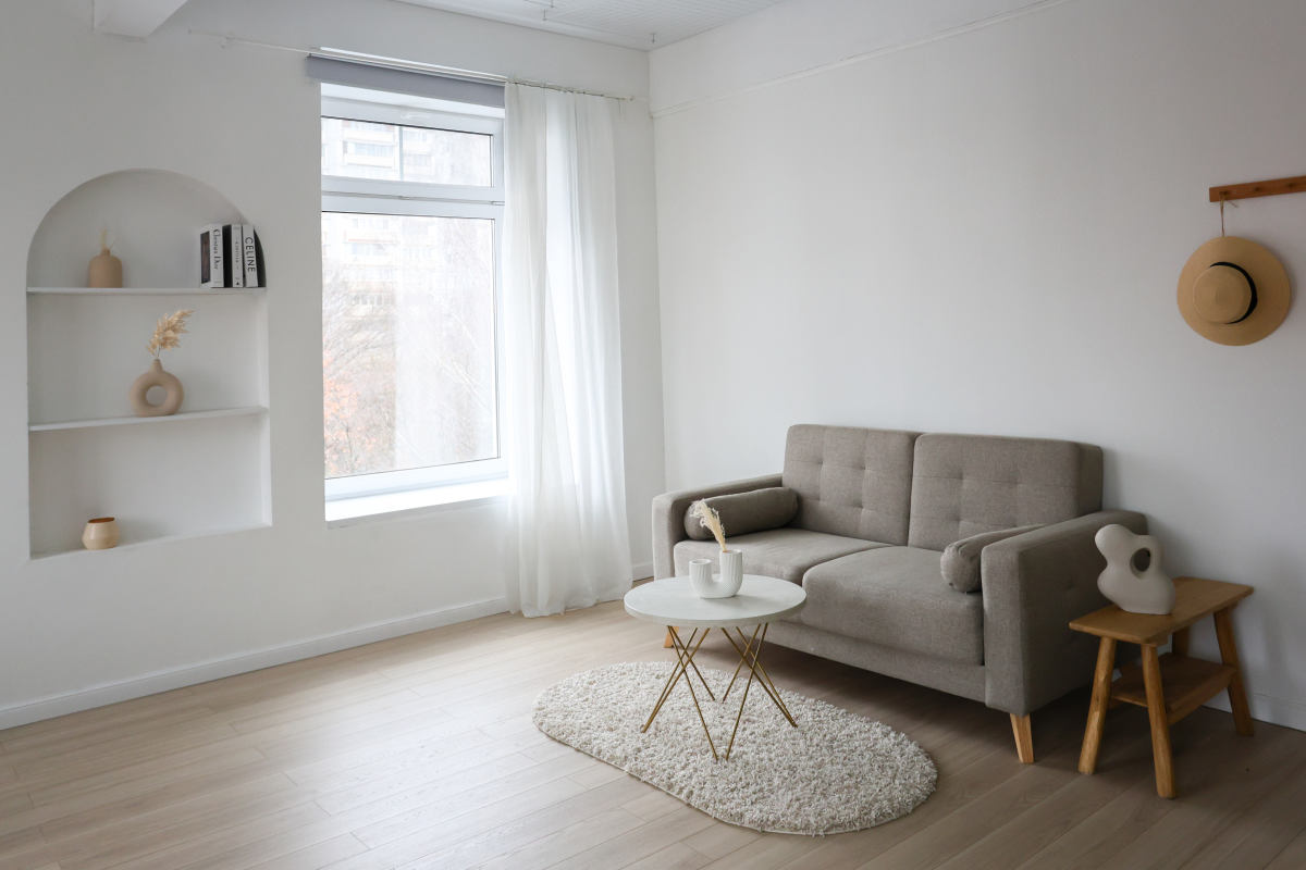 Зал в серых тонах в стиле неоклассики, минимализма и лофта.