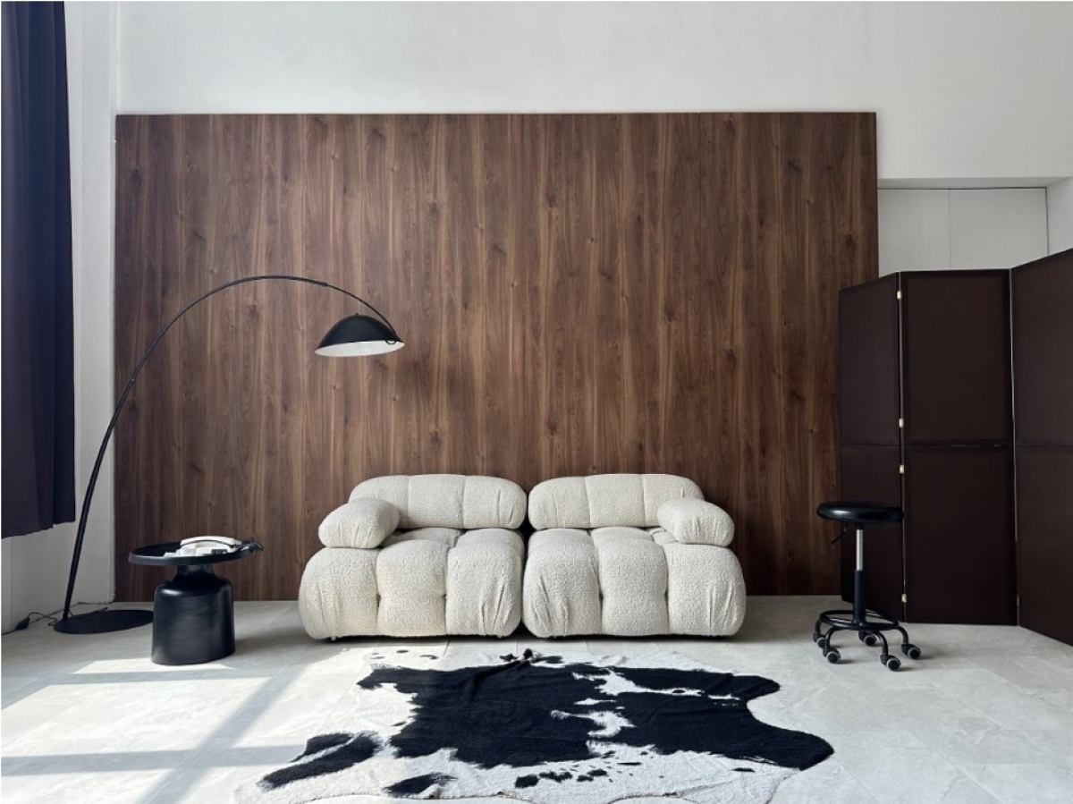 СКАНДИ (Scandi) — просторный минималистичный зал с двумя деревянными акцентными стенами и серой бетонной фактурой. Большие окна дают мягкий естественный свет, а лаконичная мебель с кожаными креслами дополняет сканди‑настроение.