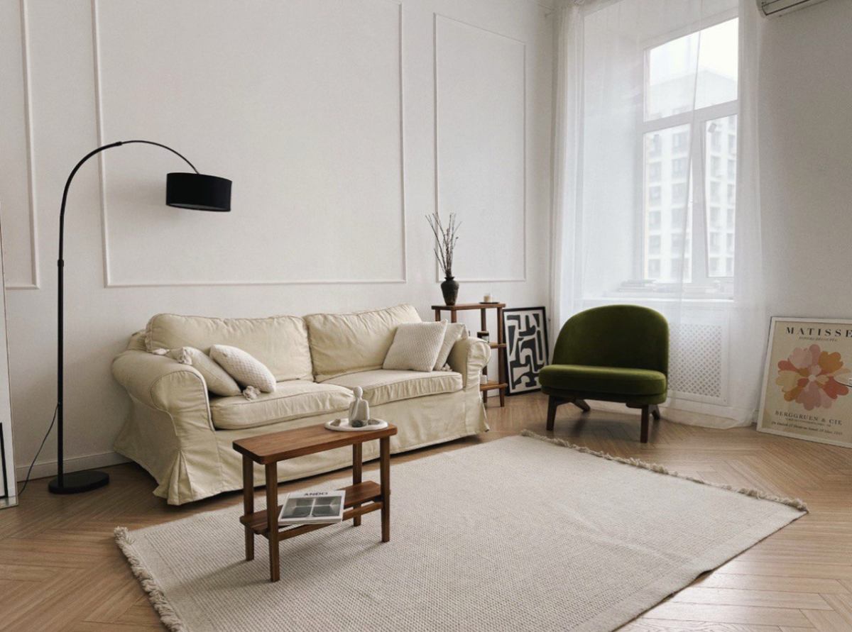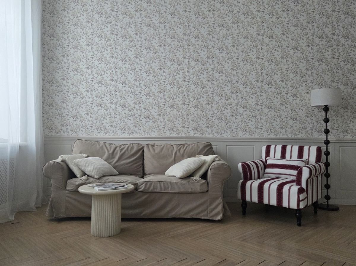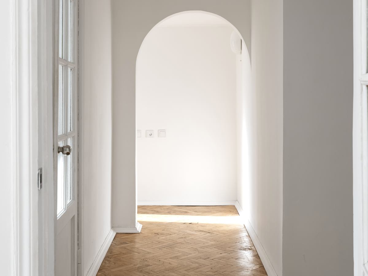 Светлое пространство с естественным светом, уютной аркой, стильным диваном и полом в "елочку".
