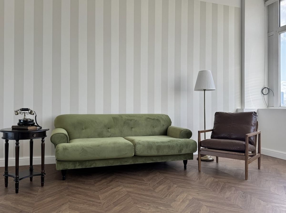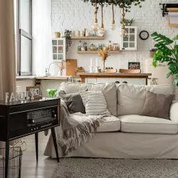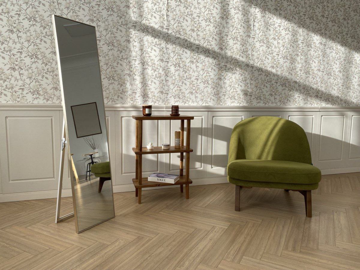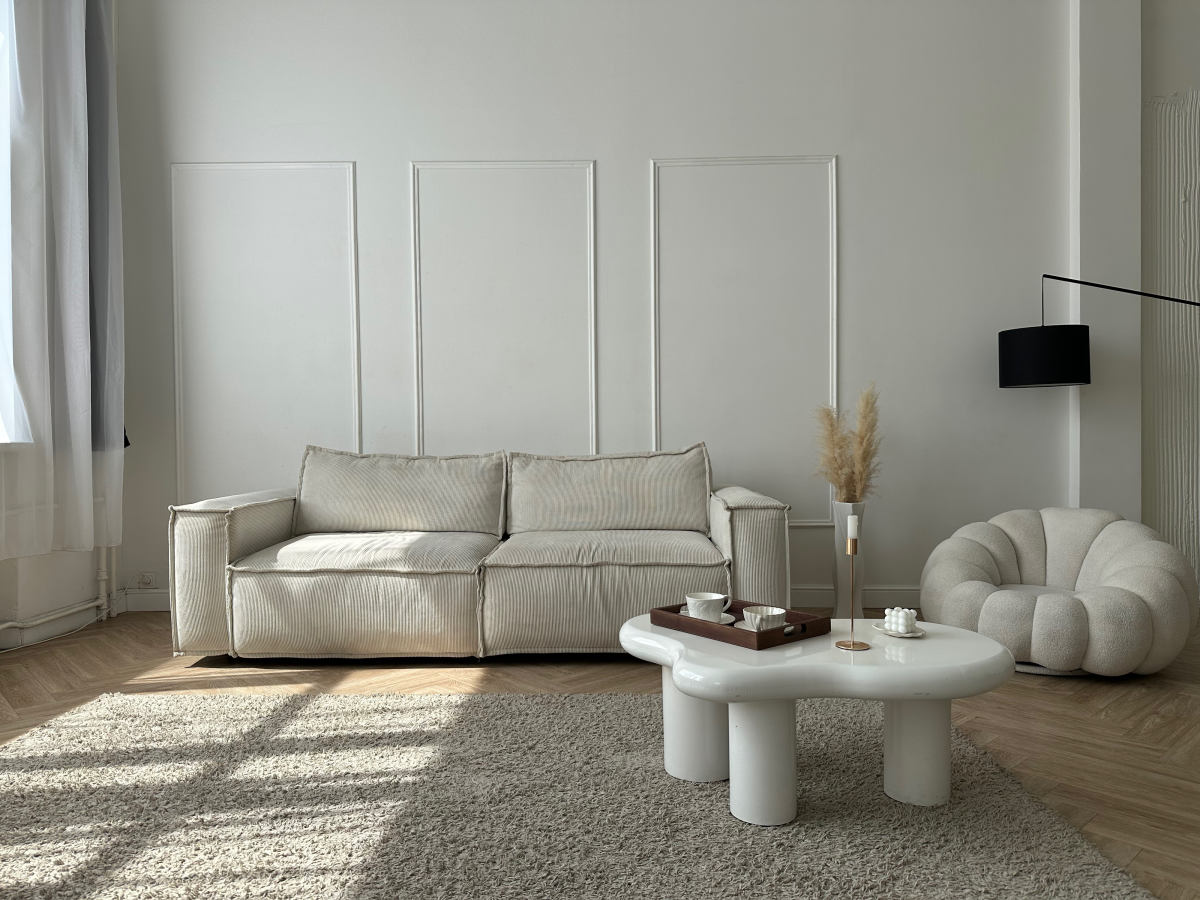 Светлое пространство с естественным светом, уютной аркой, стильным диваном и полом в "елочку".