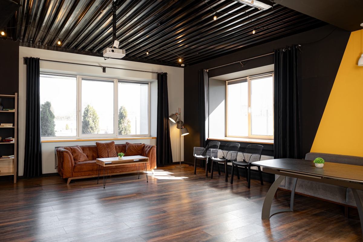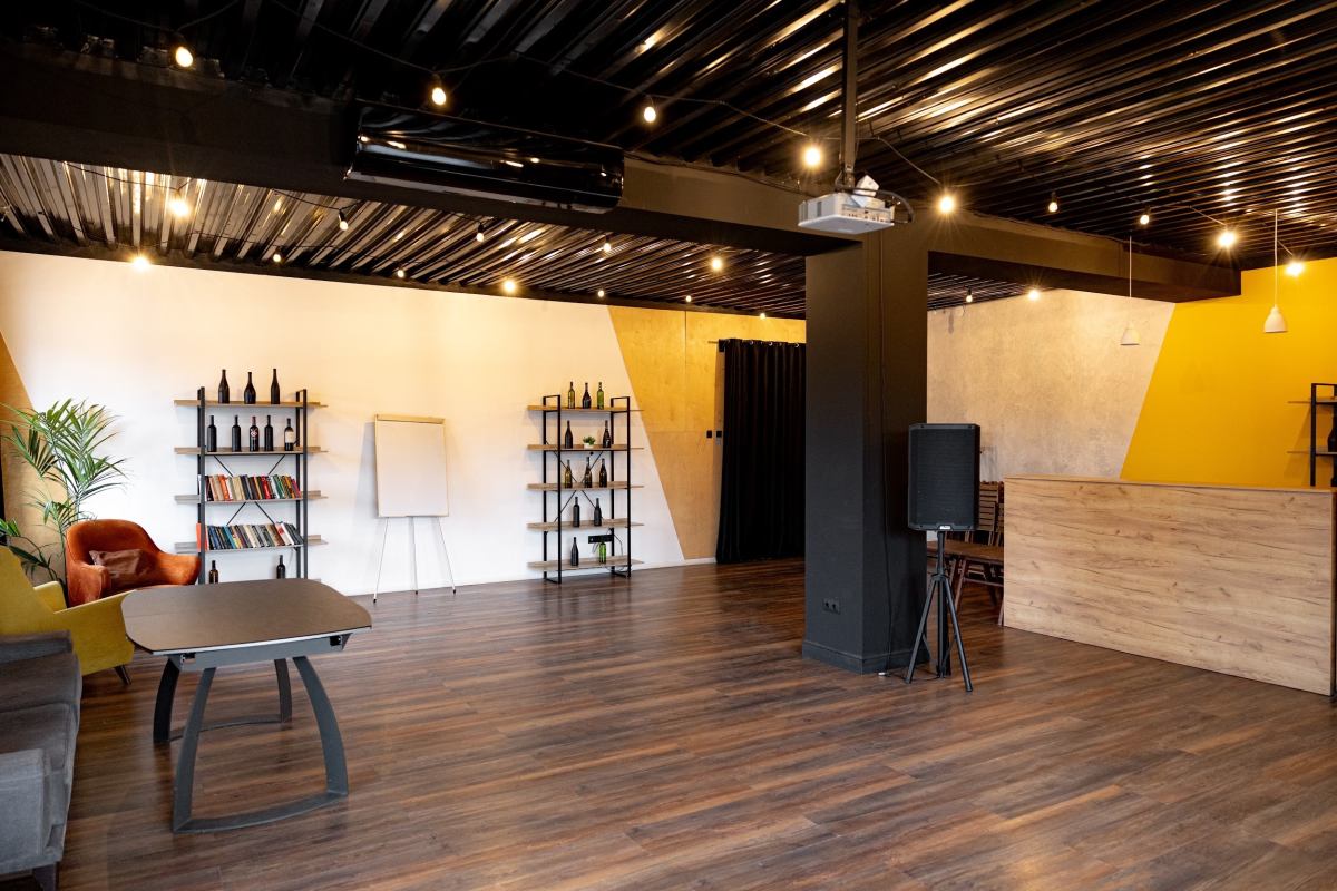 Темный и атмосферный зал, разделенный на две зоны. Подходит для съемок подкастов, видеопроектов и различных фотосъемок.