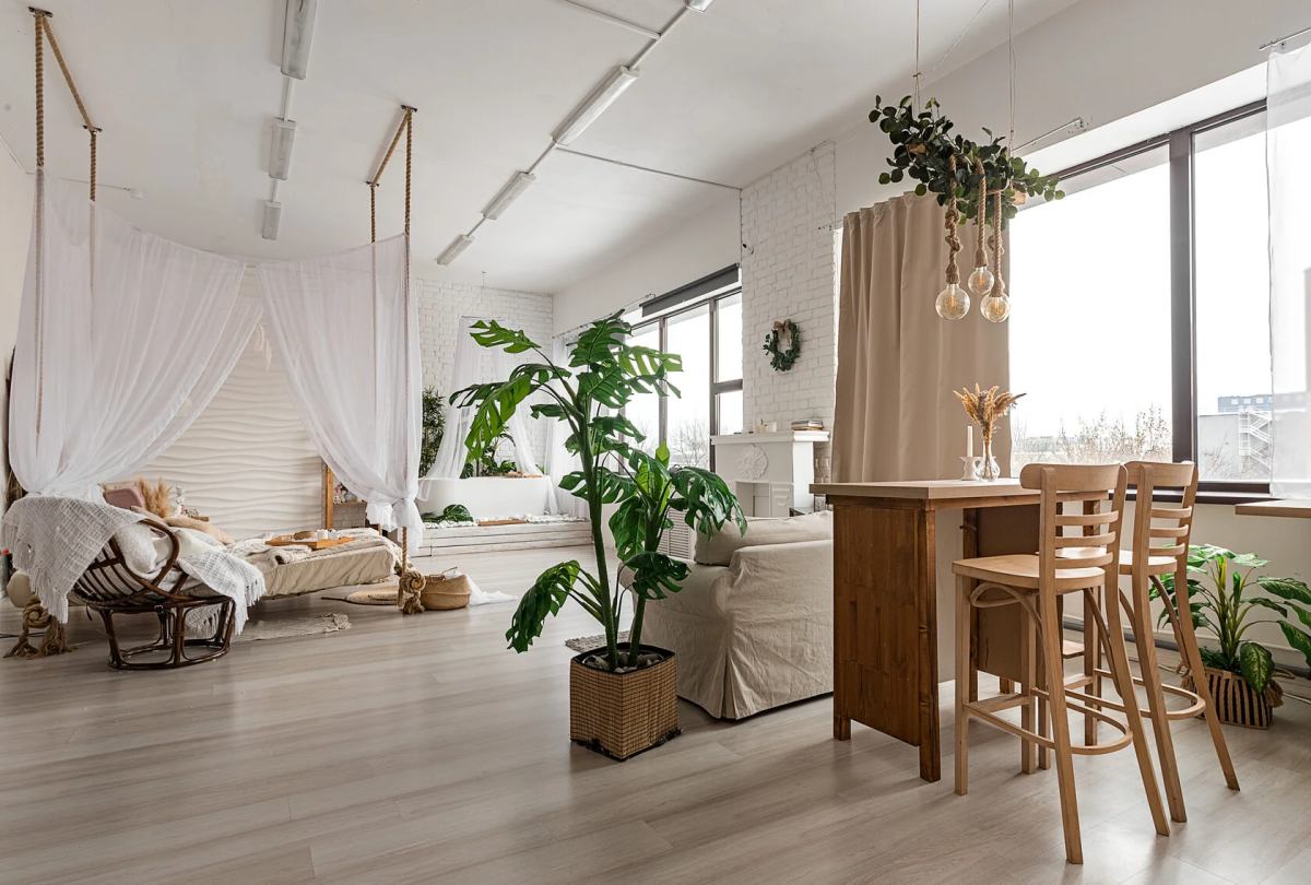 Просторный светлый зал 85 м² с белыми стенами и антресолью, катающейся кроватью и огромными окнами.