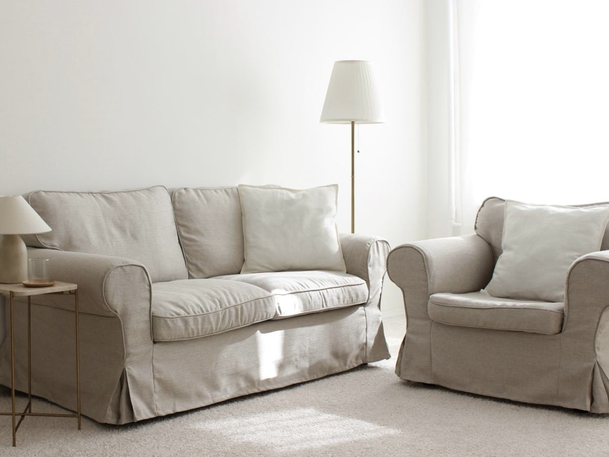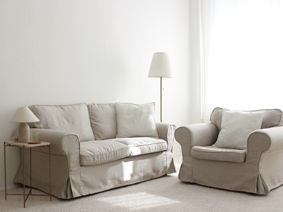 Интерьерный зал 86 м² со светлыми стенами и дизайнерской мебелью