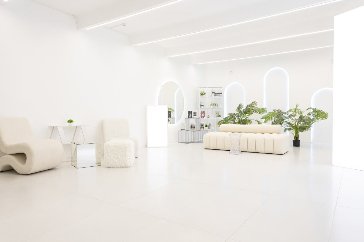 Футуристичный зал с необычными интерьерными решениями и встроенным светодиодным освещением. Идеально подходит для творческих, предметных и портретных съемок, а также танцевальных видео.