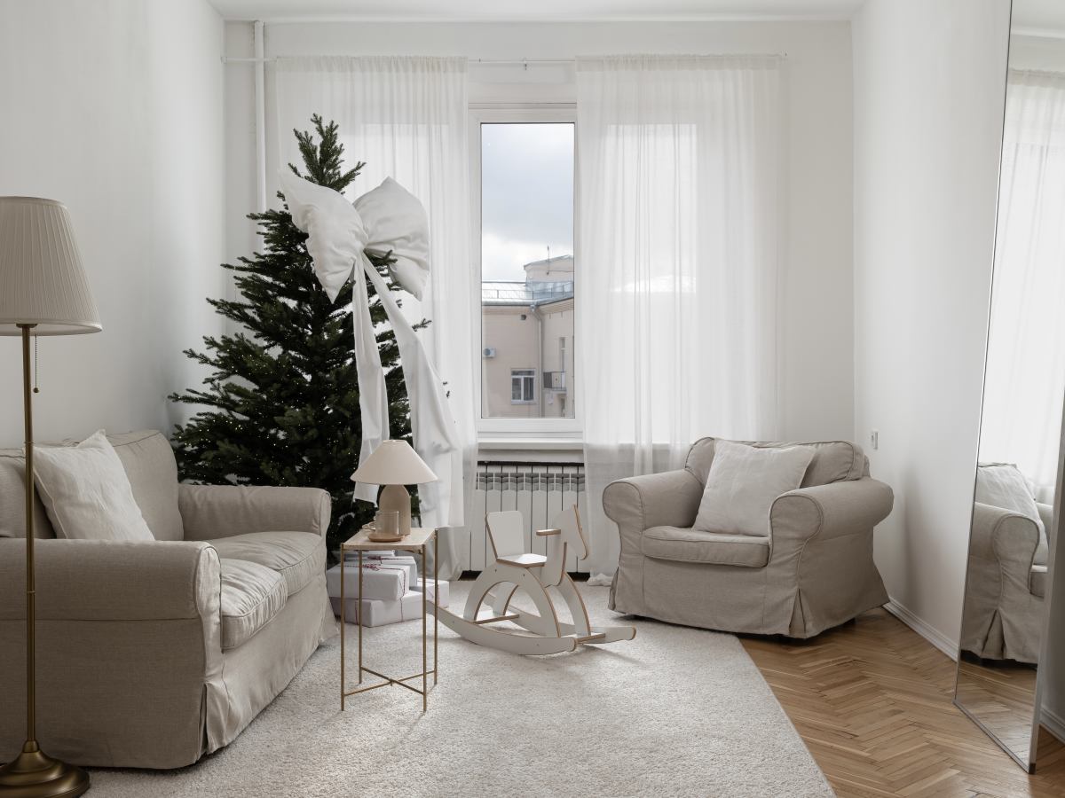 Зал в светлых тонах, 9 этаж, панорамные окна, красивый новогодний декор, имитация гостиной и кухни, однотонные и дизайнерские фоны (тканевые и бумажные), белая стена, профессиональное оборудование.