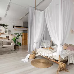 60 кв. м., потолок 5 метров, большое окно 5×3 метра на солнечную сторону. Тёмно-серые шторы блэкаут. Большой выбор тканей, фонов и предметов интерьера, идеально сочетающихся друг с другом.