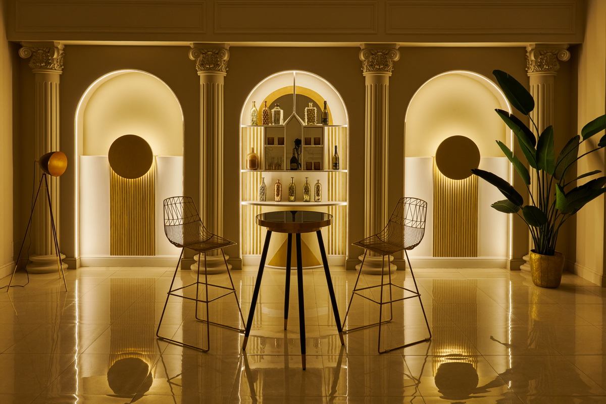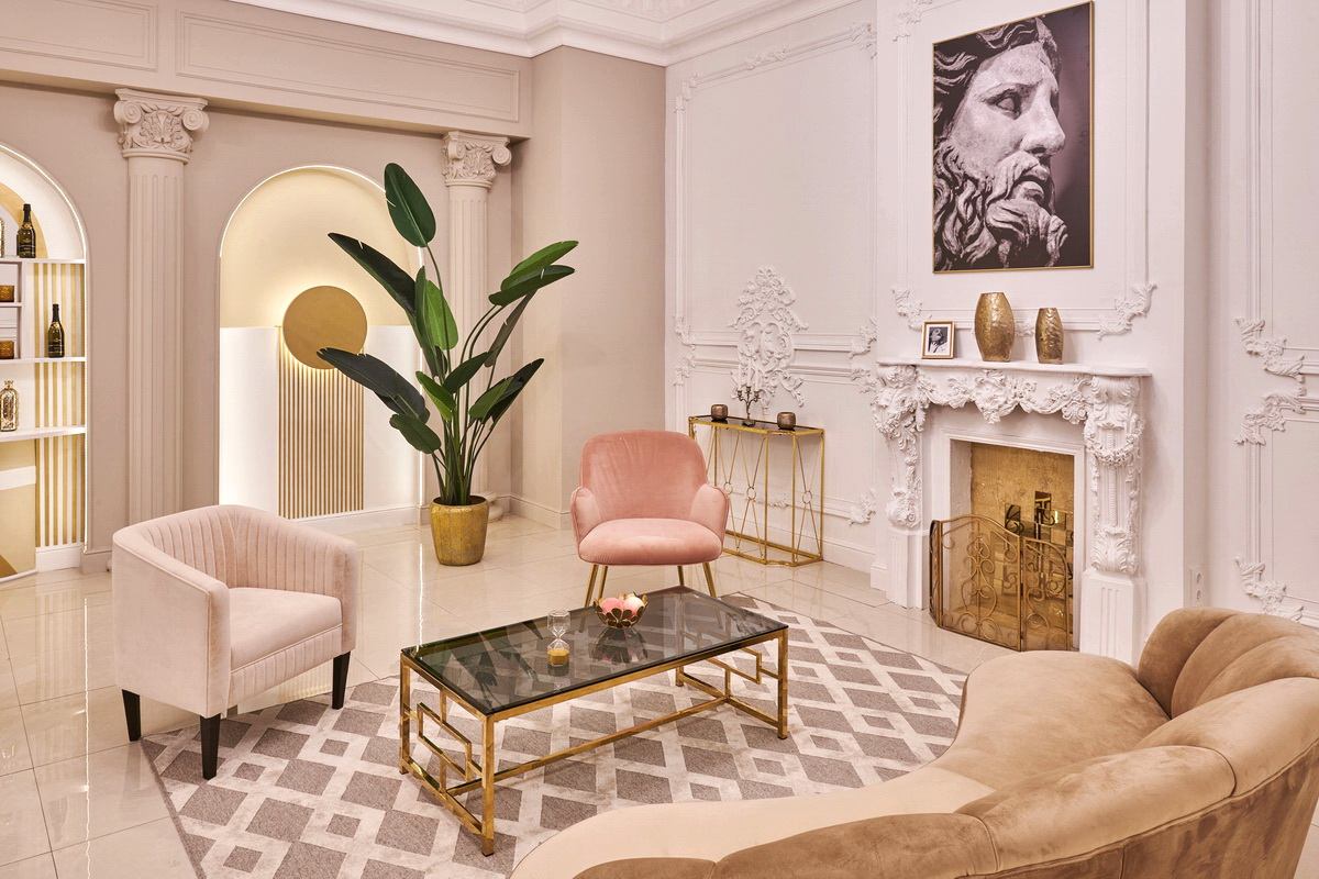 Классический светлый зал с дизайнерской мебелью, мотивами ар-деко и яркими акцентами.