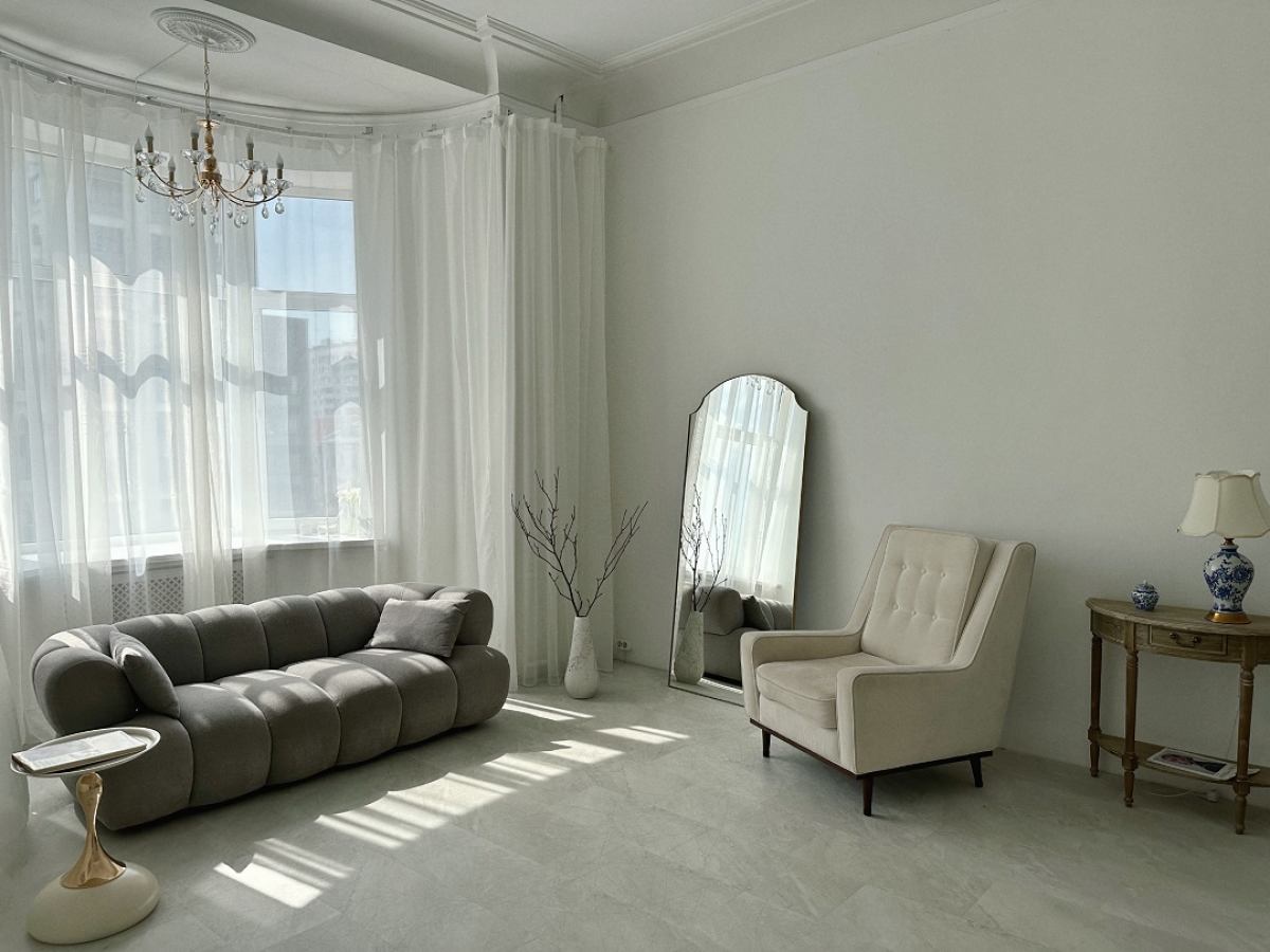 Просторное помещение с высокими потолками, панорамными окнами, неоновой подсветкой и блэк-аут шторами для полного контроля над светом. Уютная зона отдыха и удобное расположение сделают процесс съемки комфортным.