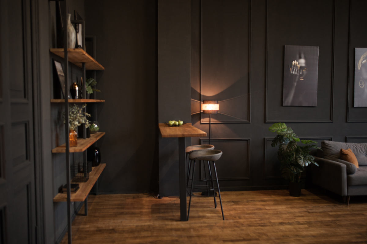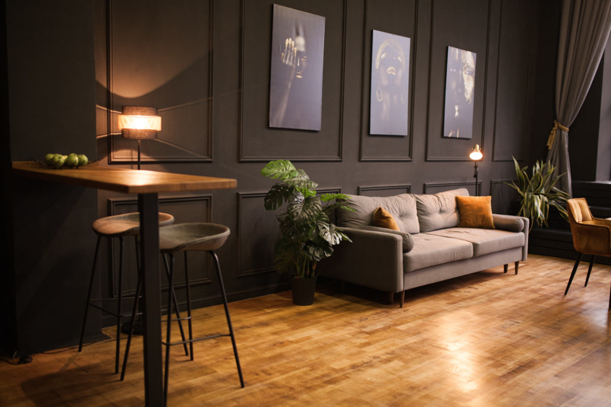Зал в серых тонах в стиле неоклассики, минимализма и лофта.