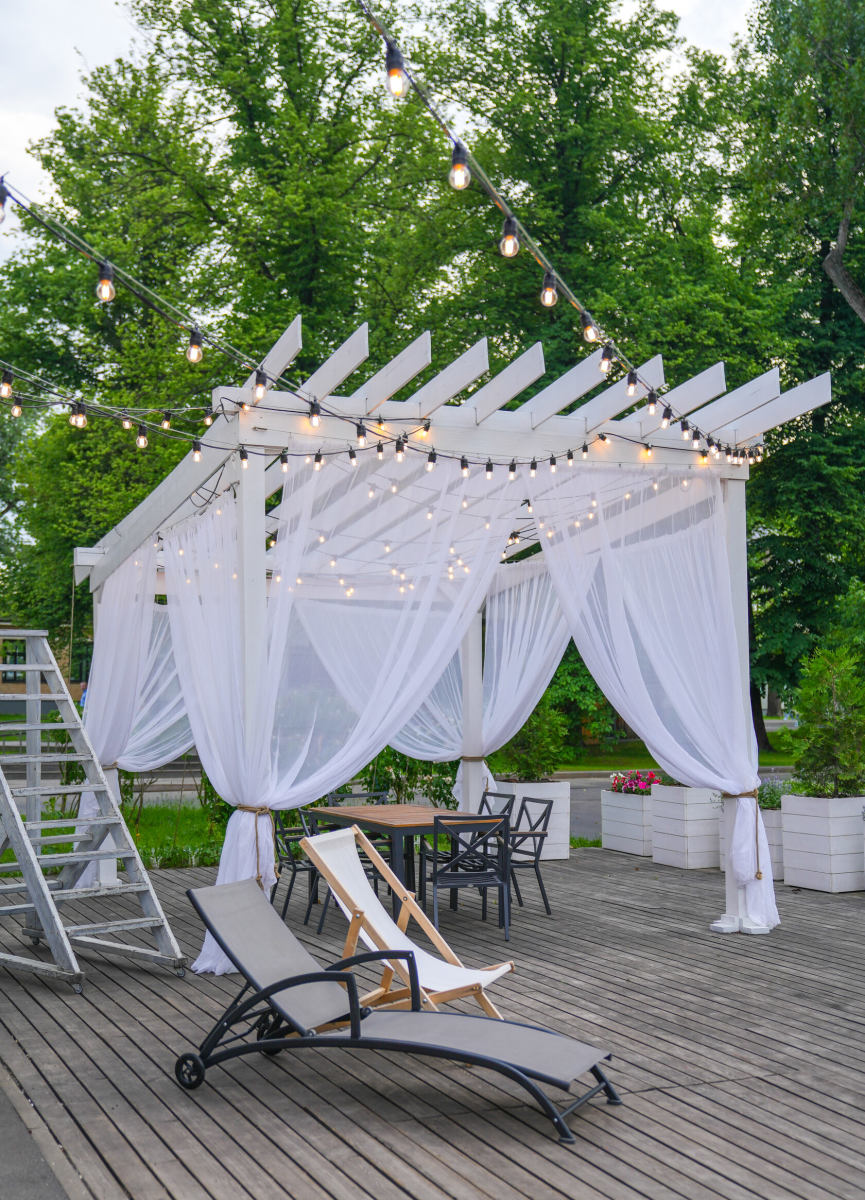 Площадка для проведения уличных фотосессий. Деревянный настил, большая беседка (пергола), большая клетка, качели. Установка шатра Линдберга.