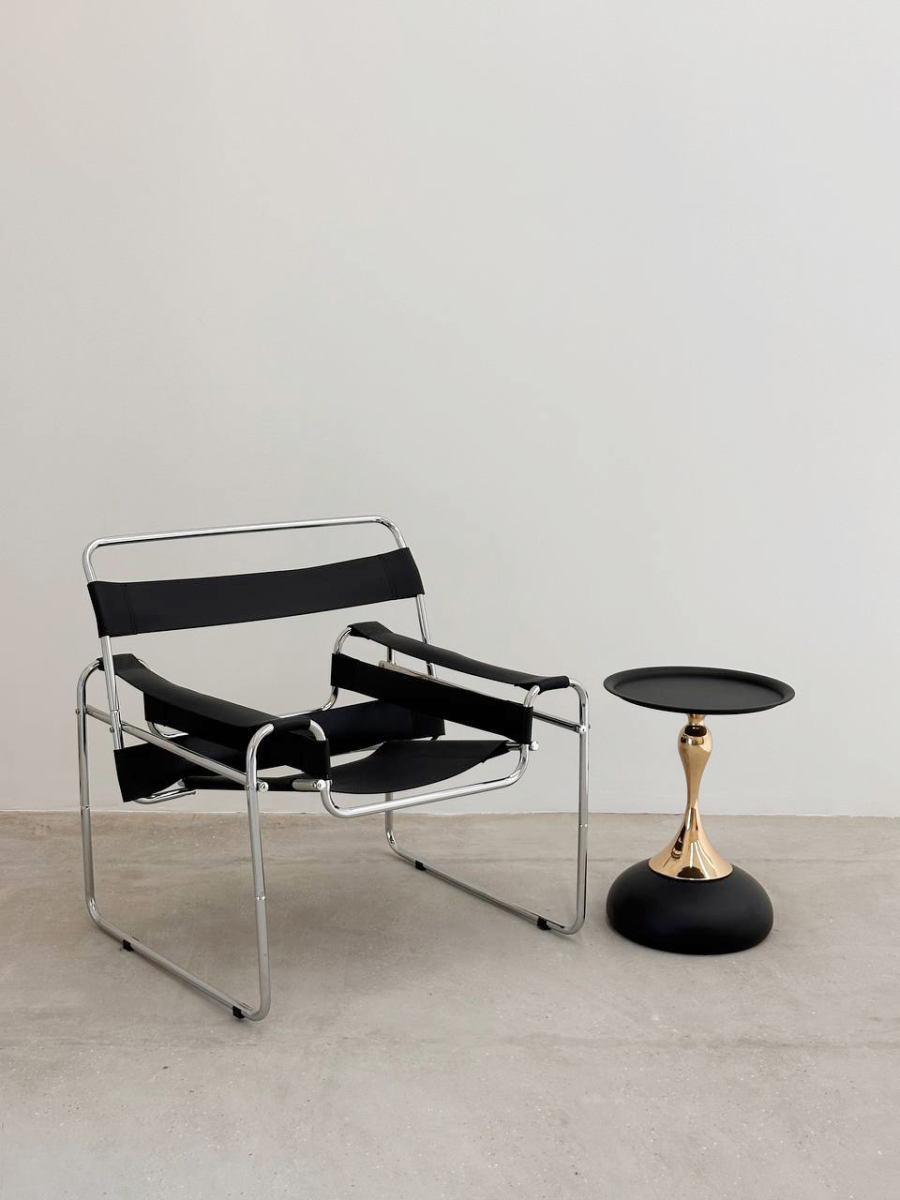 Современный интерьерный зал со светлыми стенами и трендовой мебелью.