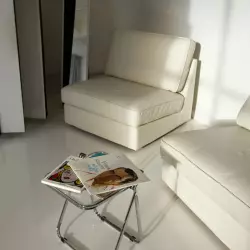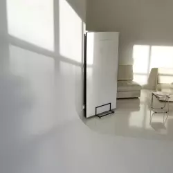 Зал Mini — небольшое минималистичное пространство, в котором сочетается бетонный пол и молочные оттенки мебели.