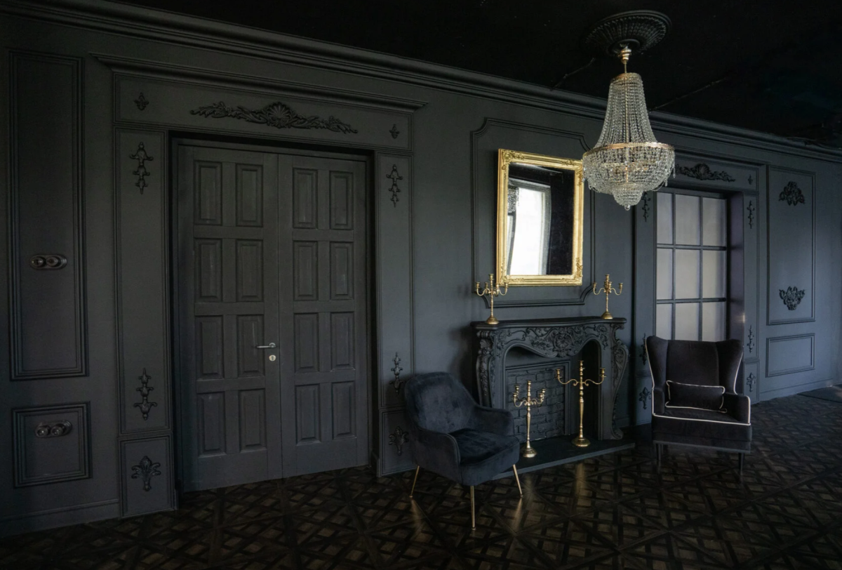 Большой зал "Honey". 3 разные фотозоны, наполняемая ванна, будуар, кровать с балдахином, чёрная циклорама, чёрная фотозона с золотыми подсвечниками.
