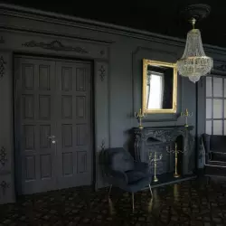 Зал с декорациями различных форм и цветов с панорамным окном и высокими потолками. Все фигуры легко передвигаются по залу.