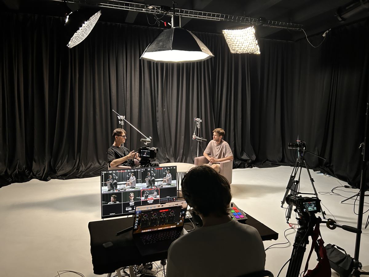 Студия для записи видео и подкастов в темных тонах (черный, графит, серый)