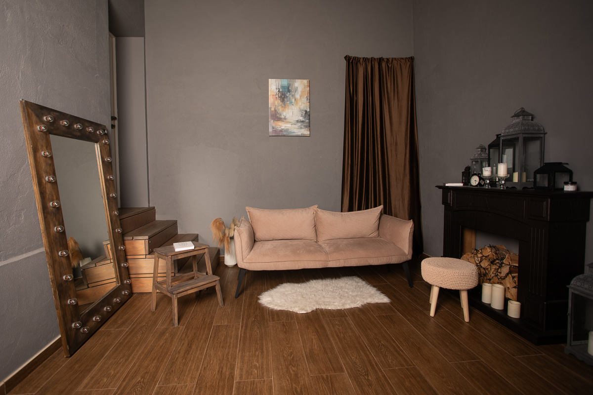 Небольшая уютная фoтостудия с серыми фактурными стенами, диваном и камином. У нас вы можете в уютной и комфортной обстановке провести съемку на фонах с импульсным или постоянным светом. Всегда в наличие белый, черный и коричневый фоны для портpeтов, пpедмeтнoй cъeмки для маpкетплeйсов. Бумажные фоны бесплатно при р