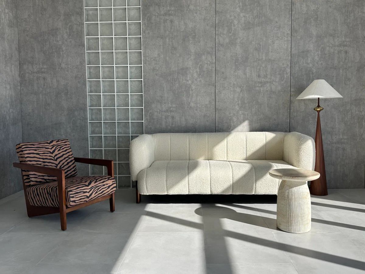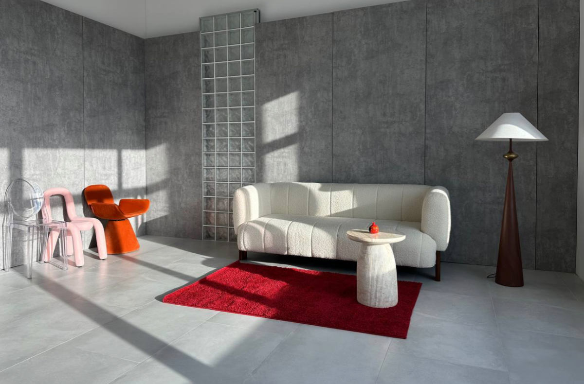 СКАНДИ (Scandi) — просторный минималистичный зал с двумя деревянными акцентными стенами и серой бетонной фактурой. Большие окна дают мягкий естественный свет, а лаконичная мебель с кожаными креслами дополняет сканди‑настроение.