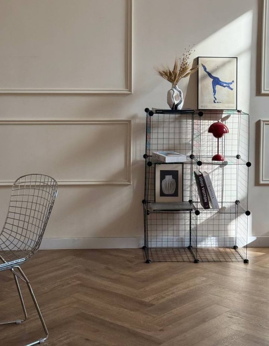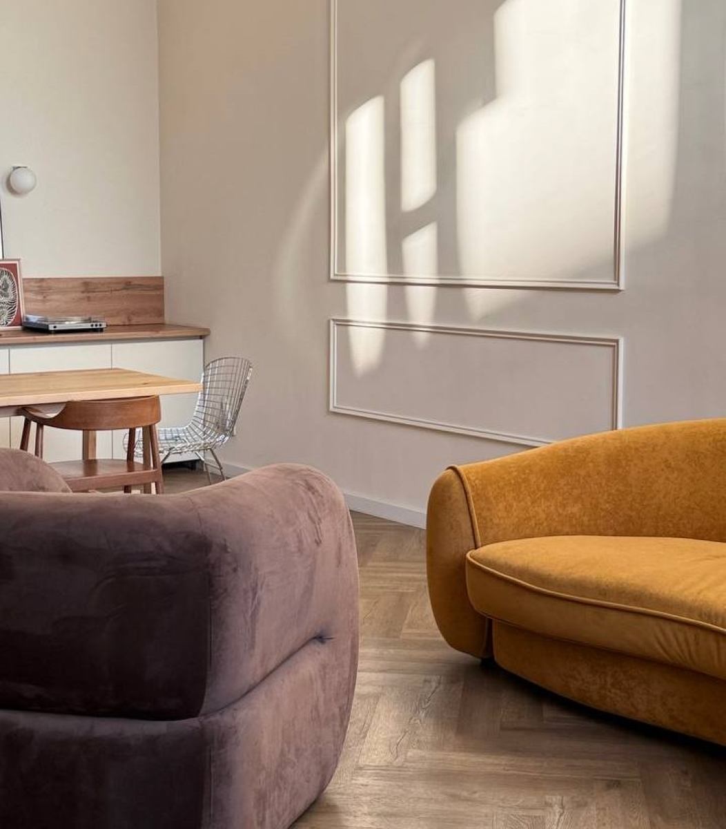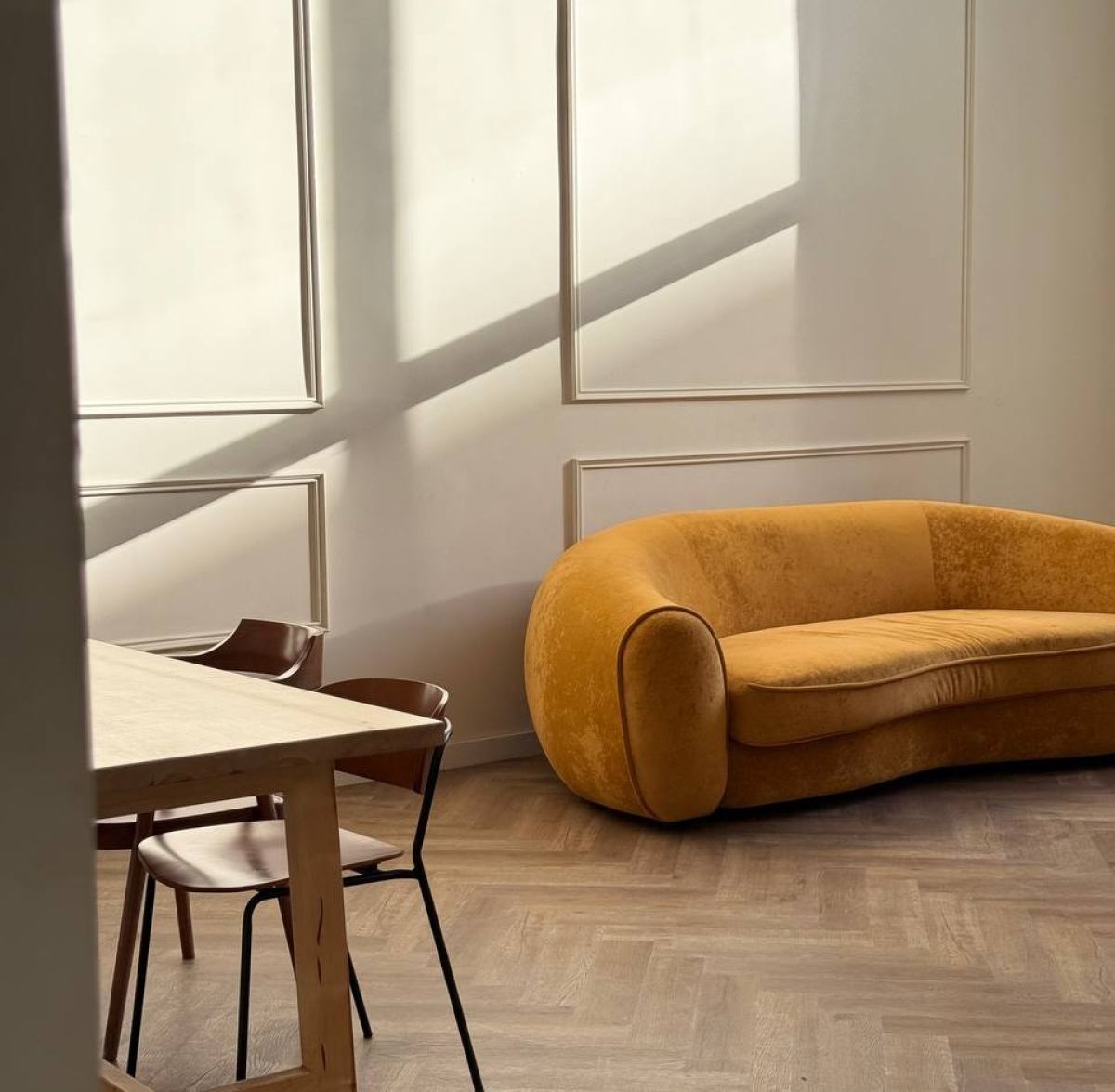 Историческое пространство с лепниной, паркетом, эркерными окнами в пол и современной мебелью.