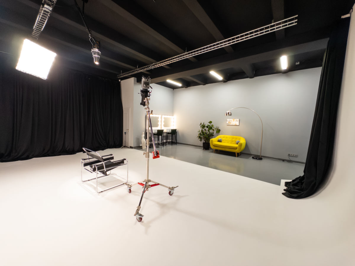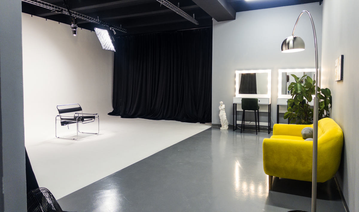 Просторное помещение с высокими потолками, панорамными окнами, неоновой подсветкой и блэк-аут шторами для полного контроля над светом. Уютная зона отдыха и удобное расположение сделают процесс съемки комфортным.