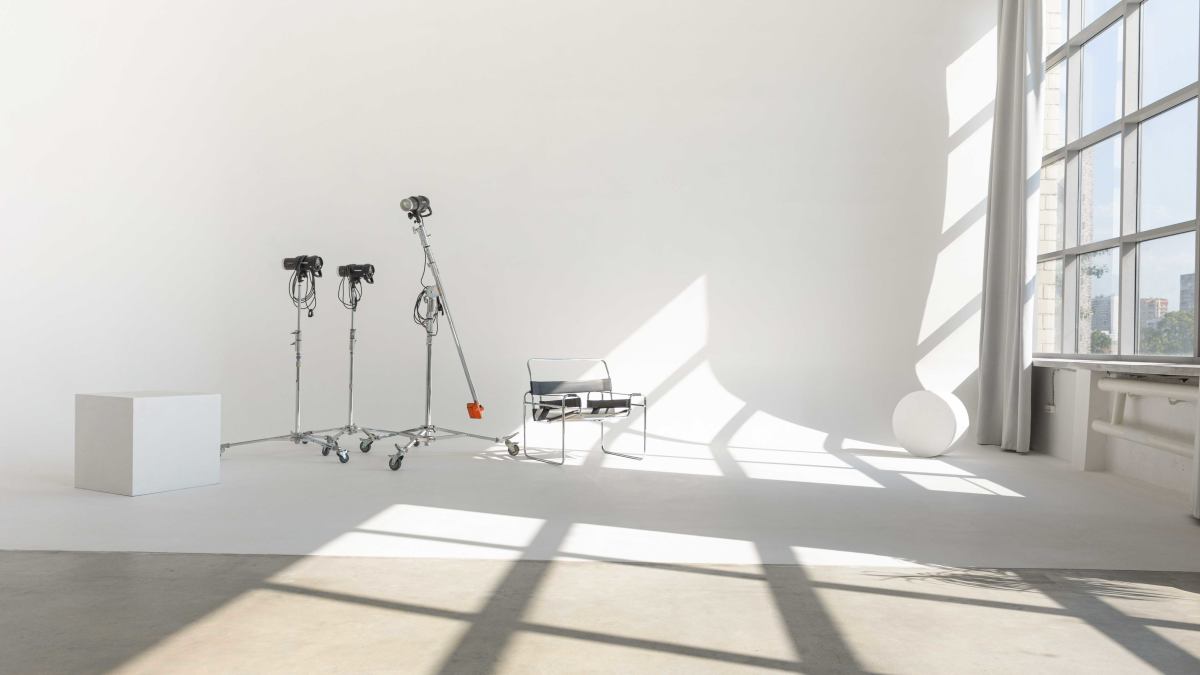 Импульсный свет Godox, циклорама, панорамные окна, интерьерная зона с мебелью, дневной свет с 10:00 до 16:00.