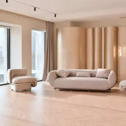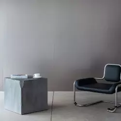 СКАНДИ (Scandi) — просторный минималистичный зал с двумя деревянными акцентными стенами и серой бетонной фактурой. Большие окна дают мягкий естественный свет, а лаконичная мебель с кожаными креслами дополняет сканди‑настроение.