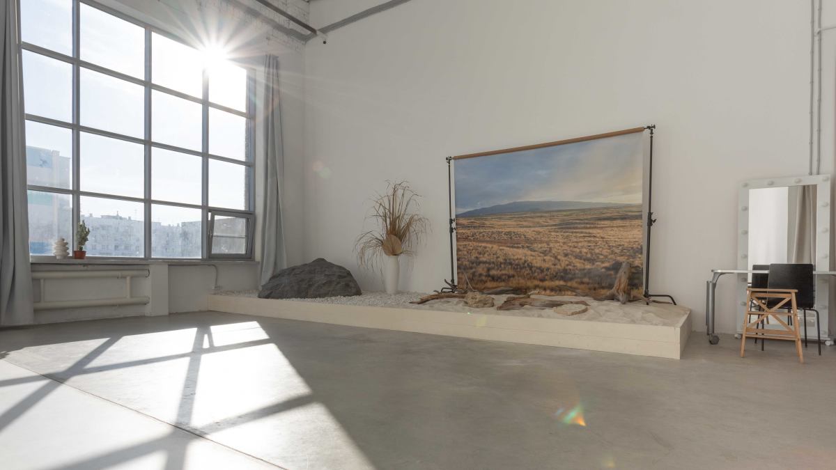 Hot- зал конструктор с большой угловой циклорамой, высокими потолками, большими окнами на солнечную сторону, песком, живыми пальмами и камнями.