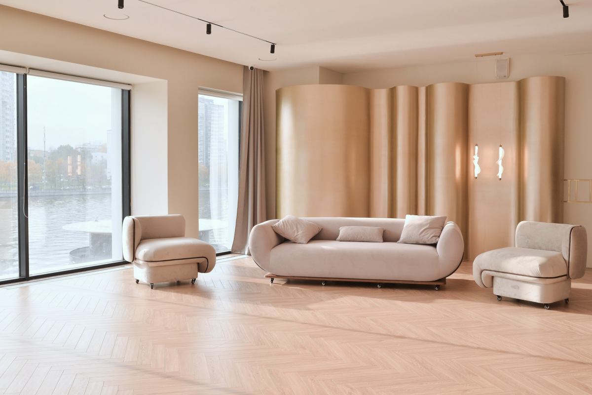 Просторный зал, светлый и минималистичный, 58 кв.м.