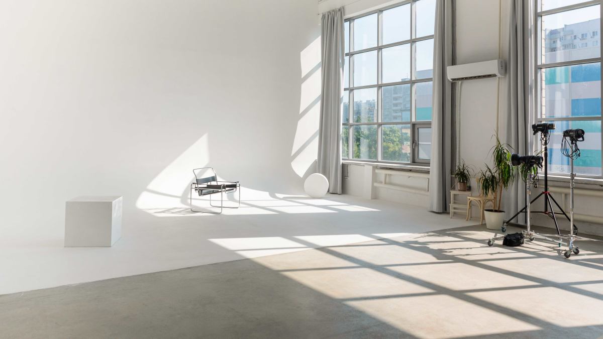 Просторный светлый зал с интерьером и угловой циклорамой.