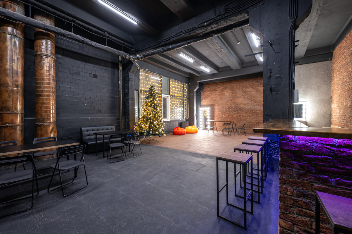 Темный лофт в минималистичном индустриальном стиле. Фактурные стены и барная стойка. Нереально просторно! Идеально для вечеринок и иных мероприятий.