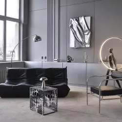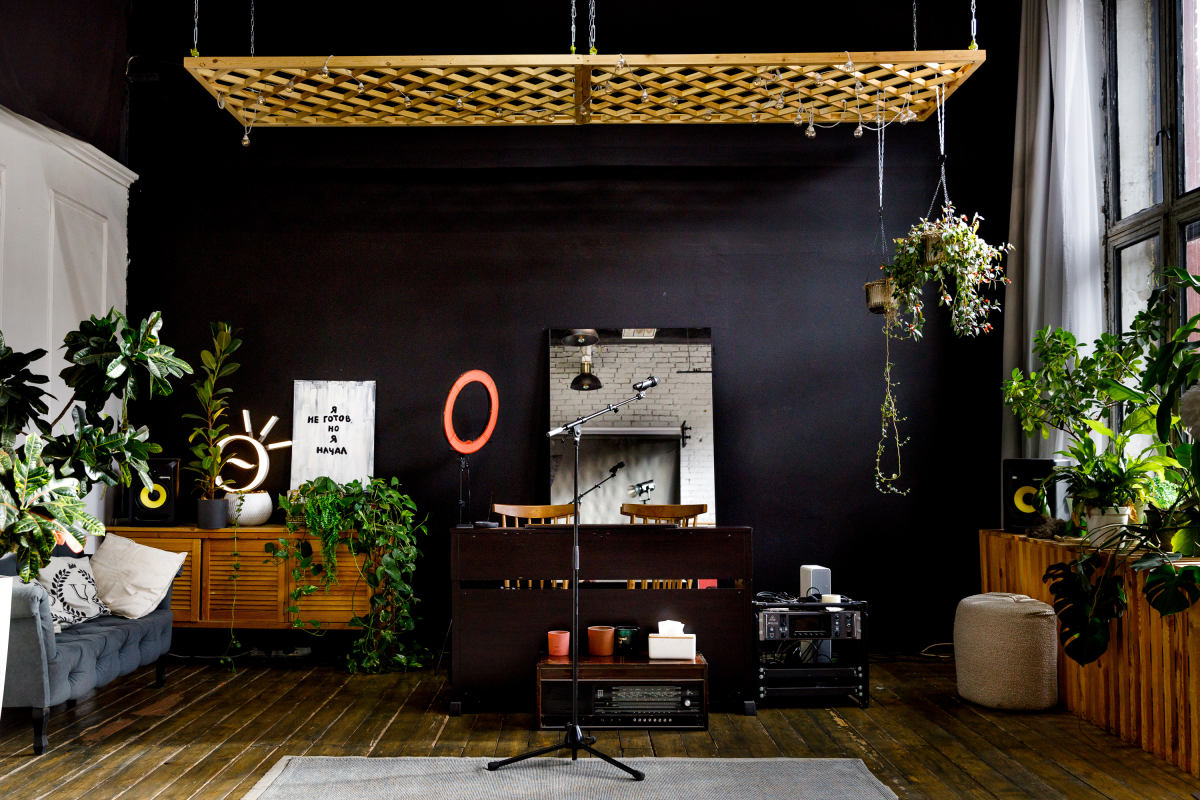 Студия для записи видео и подкастов в темных тонах (черный, графит, серый)