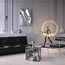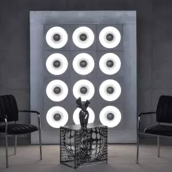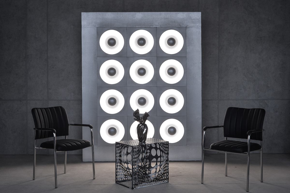 Зал без окон с неоновой локацией, стилизованной стеной под белую плитку, металлической зоной и огромным круглым светильником на потолке, так же в зале имеется гримерный стол и примерочная