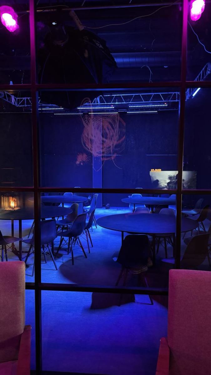 Зал в стиле мастерской художника. Невероятные фактурные стены, холсты, скульптуры, тканевый фон.