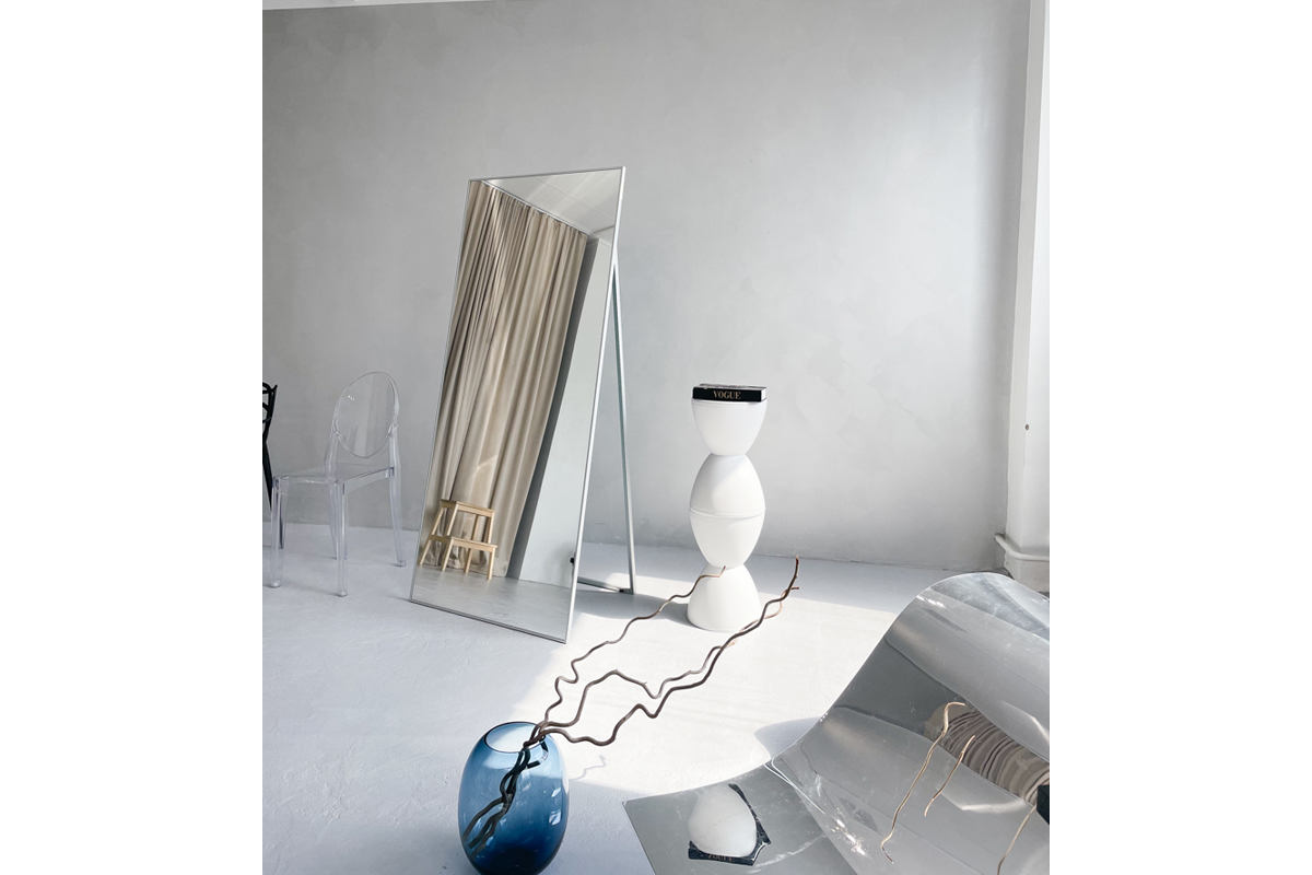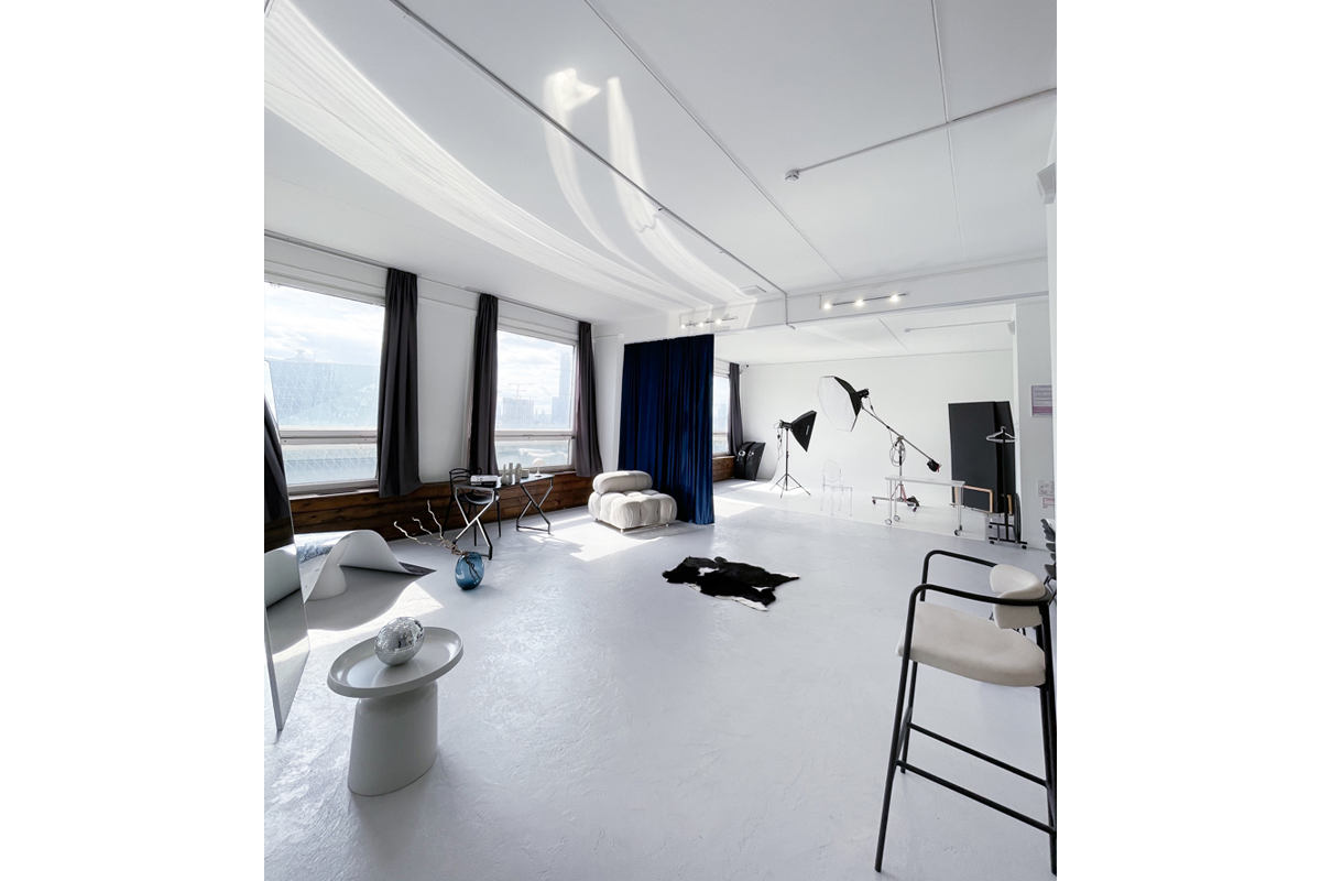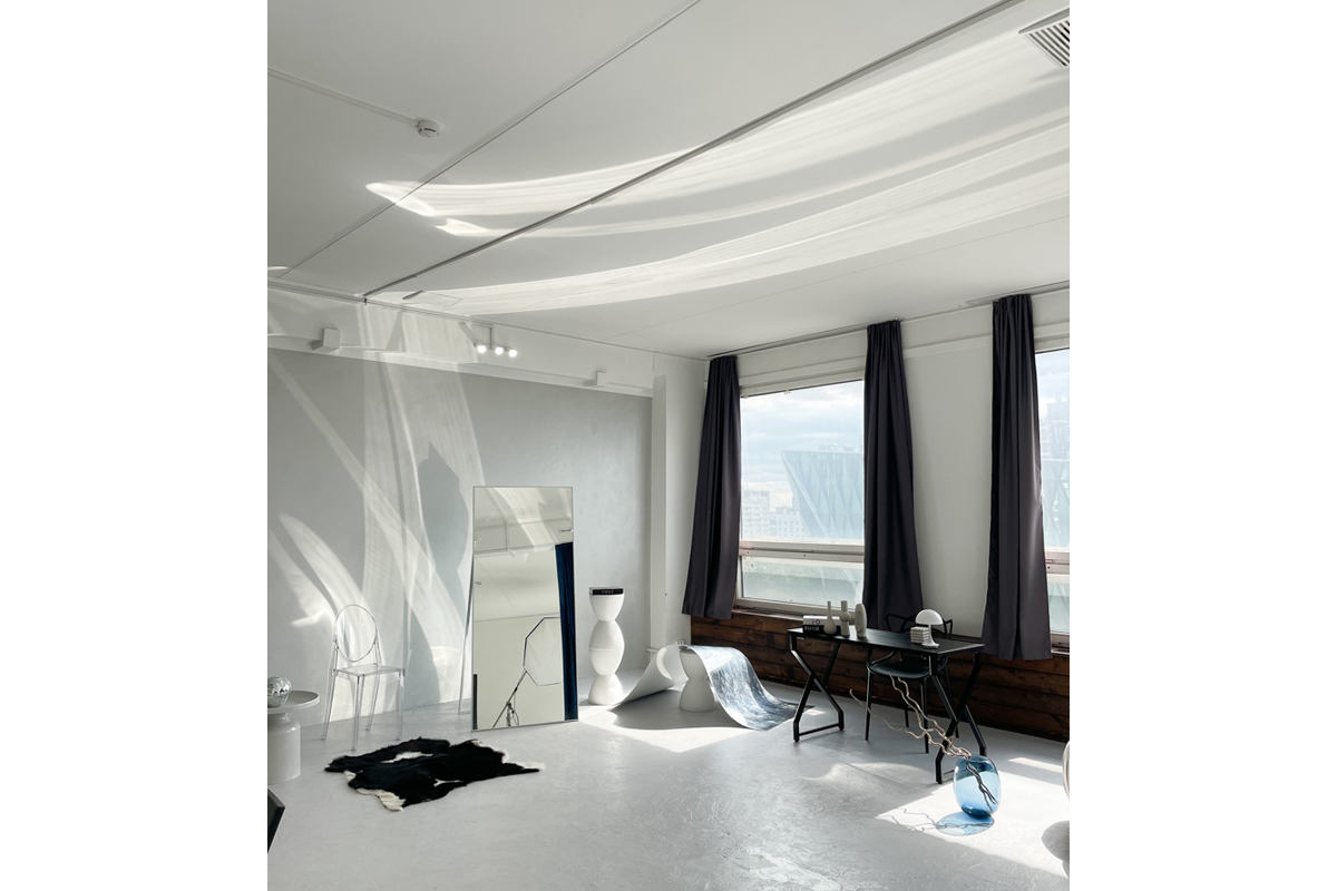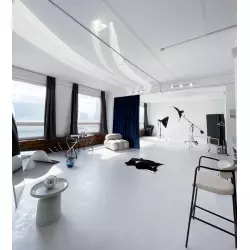 Интерьерный светлый зал с огромными панорамными окнами, выходящими на юг, что даёт яркий падающий свет в дневное время, возможность полного затемнения. Белый пол, наибольшая концентрация современных трендов и фактурных зон в одном зале. Возможность установки любого фона из наличия, высокие потолки, гримёрное место.