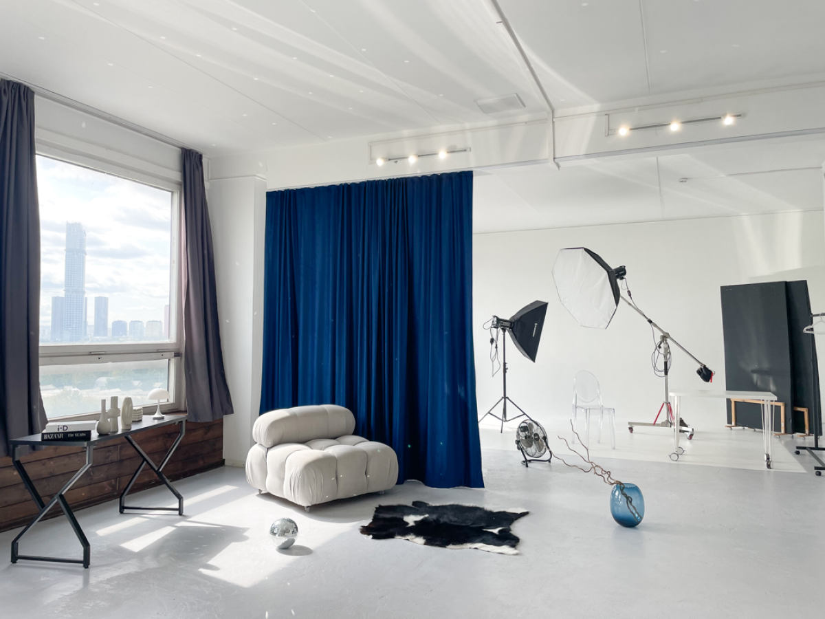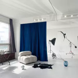 Просторное помещение с высокими потолками, панорамными окнами, неоновой подсветкой и блэк-аут шторами для полного контроля над светом. Уютная зона отдыха и удобное расположение сделают процесс съемки комфортным.