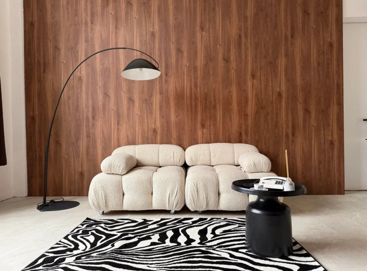 Светлое пространство с естественным светом, уютной аркой, стильным диваном и полом в "елочку".