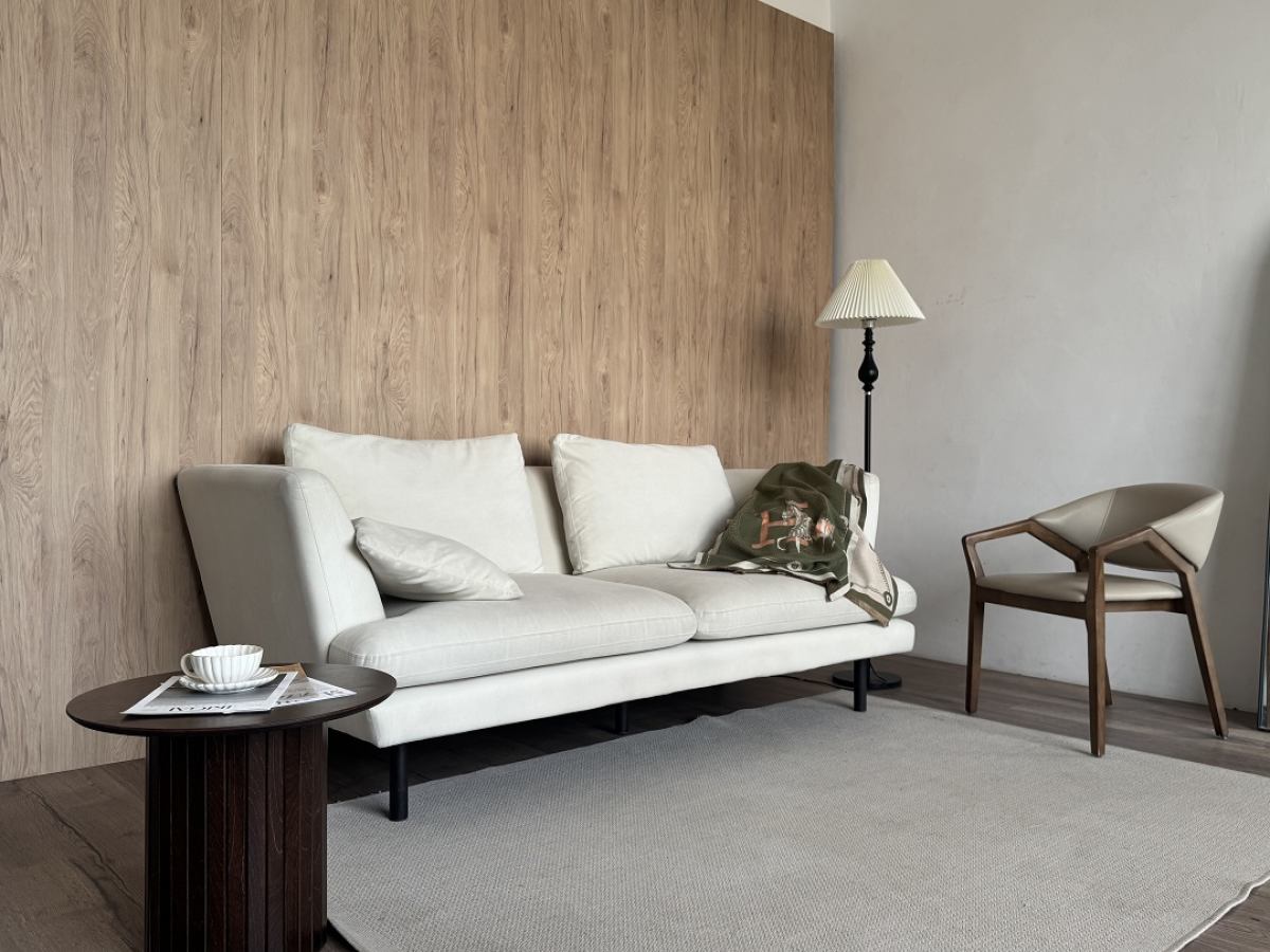СКАНДИ (Scandi) — просторный минималистичный зал с двумя деревянными акцентными стенами и серой бетонной фактурой. Большие окна дают мягкий естественный свет, а лаконичная мебель с кожаными креслами дополняет сканди‑настроение.