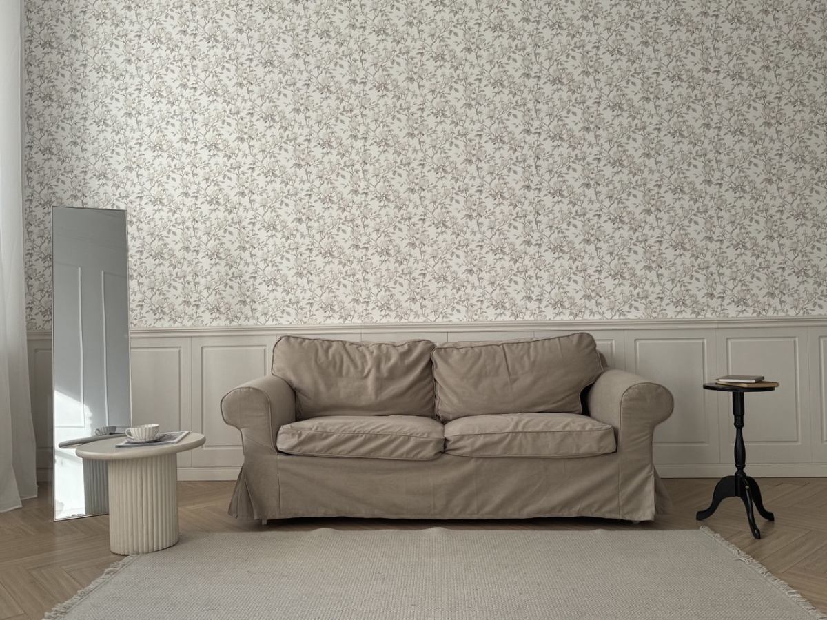 Нежный зал с будуарным настроением с акцентным, цветочным диваном, который уже завоевал сердца наших гостей, мебелью из темного дерева и винтажными, деликатными деталями.