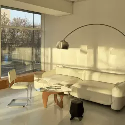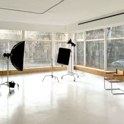 Зал с белой циклорамой 5х5 и двумя оригинальными локациями. В стоимость включены 3 импульсных и три постоянных источника.