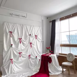 Новый, очень светлый зал с двумя большими окнами на южную сторону и с двумя - на восточную. Белая П-образная циклорама 5х4 метра. Белая стена, оформленная 3D панелями"волны".