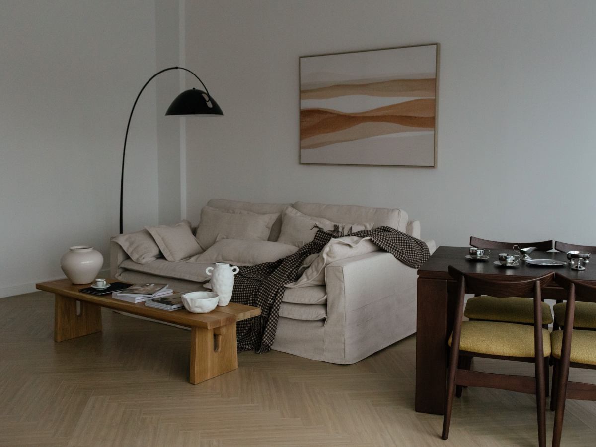 Стильный минималистичный зал в тёмных оттенках с циклорамой и зоной интерьера.
