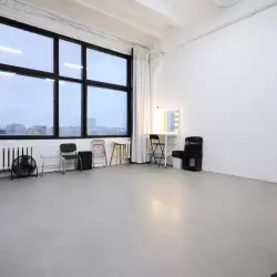 Белый зал площадью 38 кв.м. с большими окнами и солнечной стороной весь световой день, бетонным полом и всем необходимым оборудованием. Зал используют для съемок модельных снэпшотов (снэпов), модельных тестов и каталогов одежды