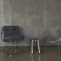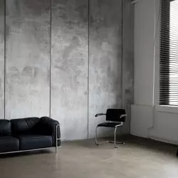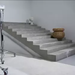 Угловая циклорама 5х5, интерьерная стена с серым полом и мебелью, и угол с большой бетонной лестницей.