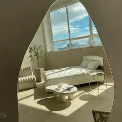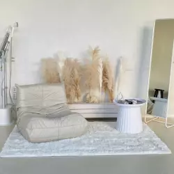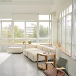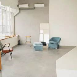 Просторный зал с циклорамой, стильной мебелью и с большим количеством естественного света.