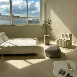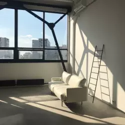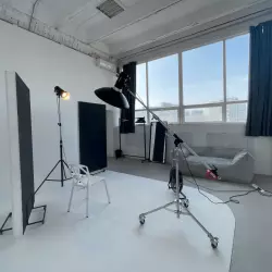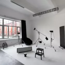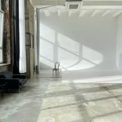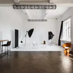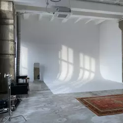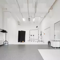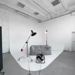 Белый зал площадью 60 кв.м. с белоснежной матовой циклорамой, большими окнами и солнечной стороной весь световой день, бетонным полом и всем необходимым оборудованием. Зал подойдет для профессиональной съемки каталогов одежды, обуви и аксессуаров, а также имиджевых съемок в минималистичном стиле.