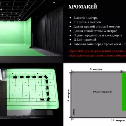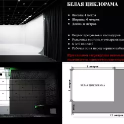 Хромакей циклорама, белая циклорама и театральная сцена в одном зале. Возможна запись чистого звука.