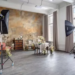 60 кв. м., потолок 5 метров, большое окно 5×3 метра на солнечную сторону. Тёмно-серые шторы блэкаут. Большой выбор тканей, фонов и предметов интерьера, идеально сочетающихся друг с другом.