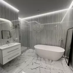зал MARBLE - полностью отделанный мрамором зал, с ванной, душевой кабиной со стеклянной дверью и мозаичным полом, зеркалом в полный рост, а так же совершенно всеми необходимыми атрибутами ванной комнаты: раковина, большое круглое зеркало над ней, а так же туалетная зона (муляж).