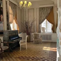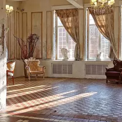 Светлый зал - 7 больших окон на юг и восток. Изящные люстры, светлые стены со следами времени и винтажный пол.