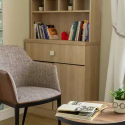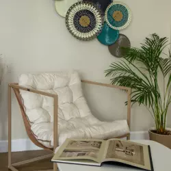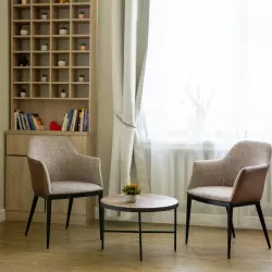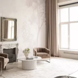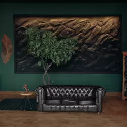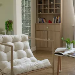 Второй зал (60м) интерьерный с дизайнерской мебелью из Италии. Большой фикус в горшке, меховой диван, кресла и мраморный столик, книжный стеллаж. 4 больших окна дают естественное освещение.